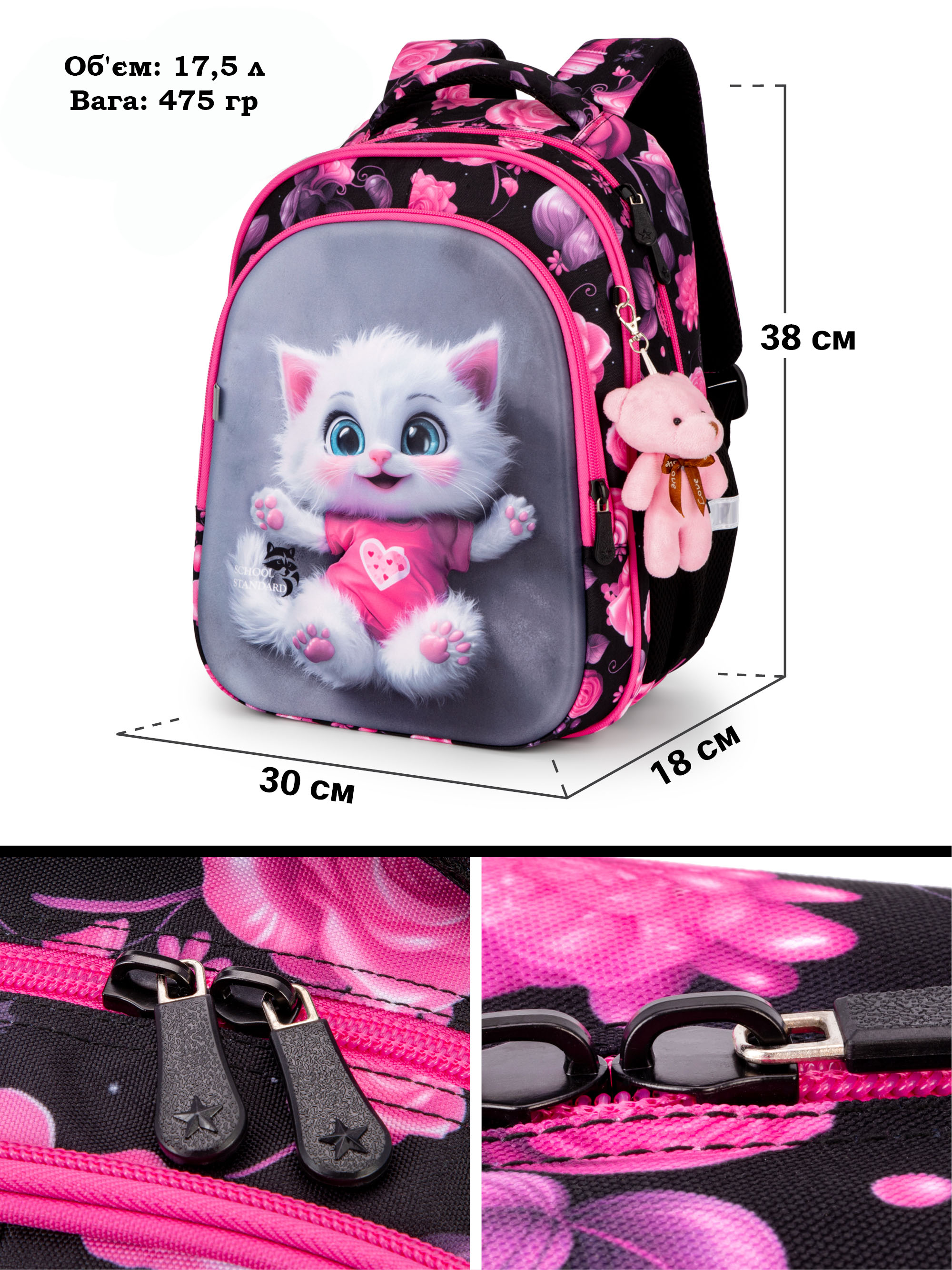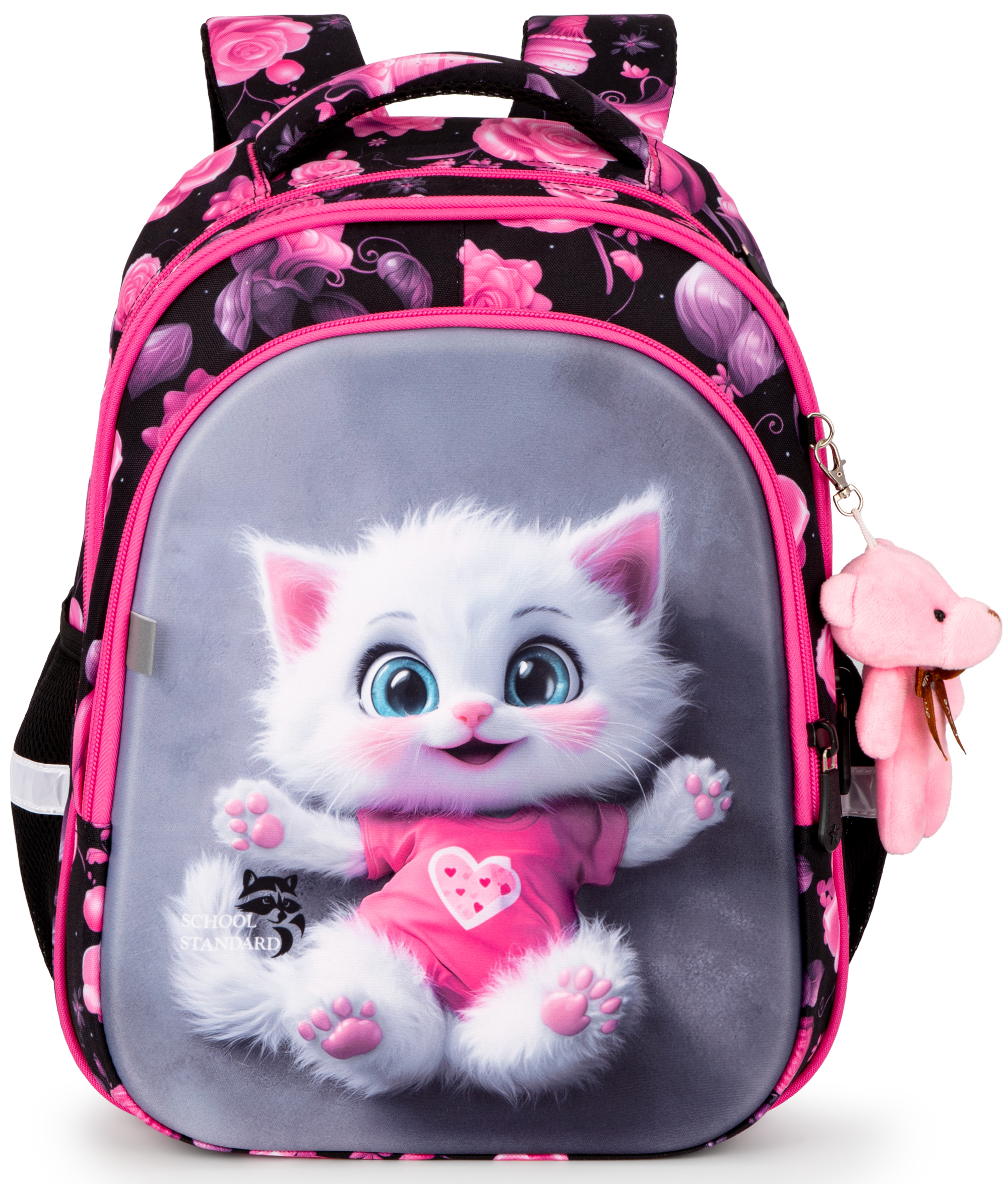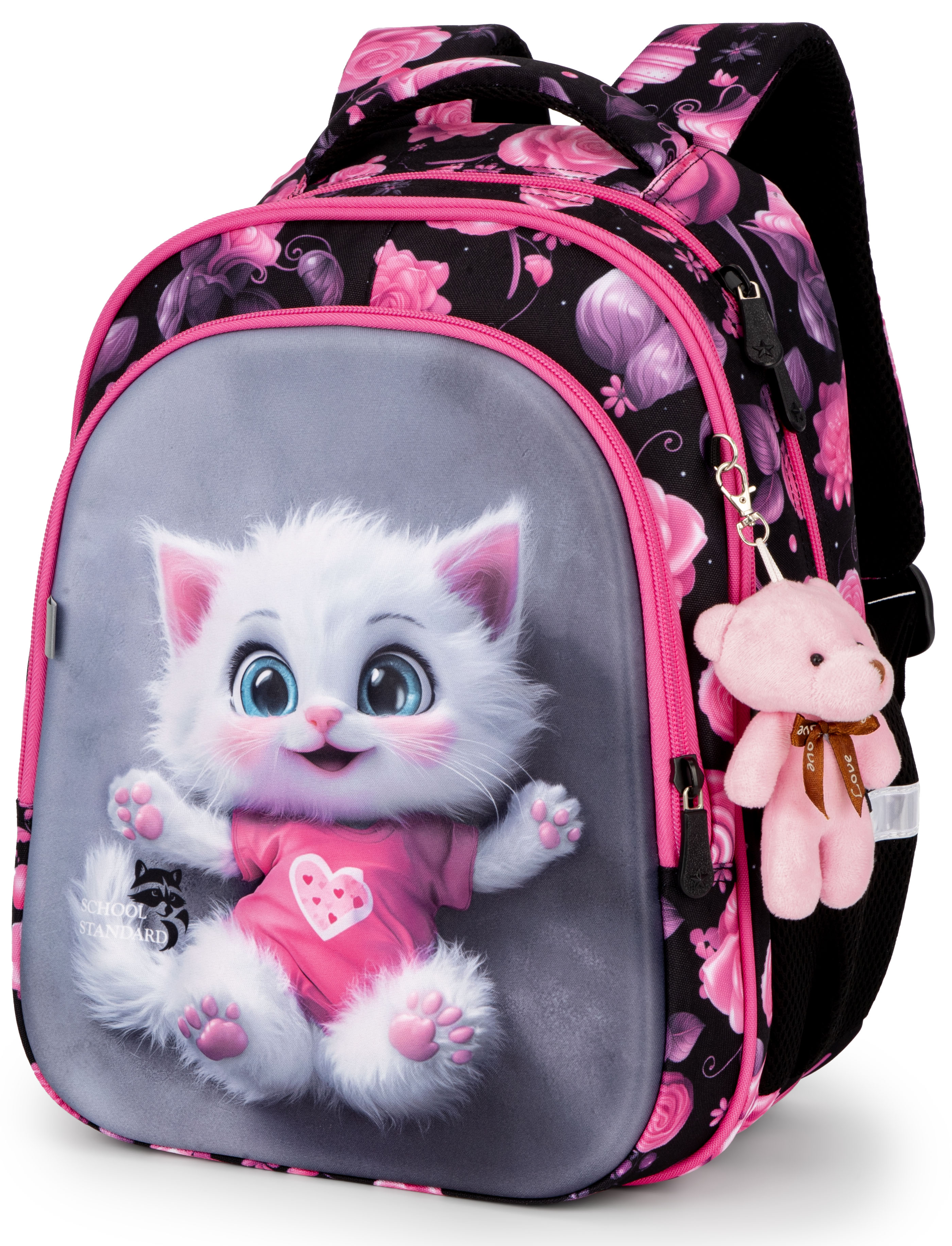 Яскравий стильний шкільний рюкзак School Standard (СкулСтандард) з анатомічною спинкою та ведмедиком на брелку у подарунок просто створений для дівчинки початкових класів. Його розмір 38х18х30 см .