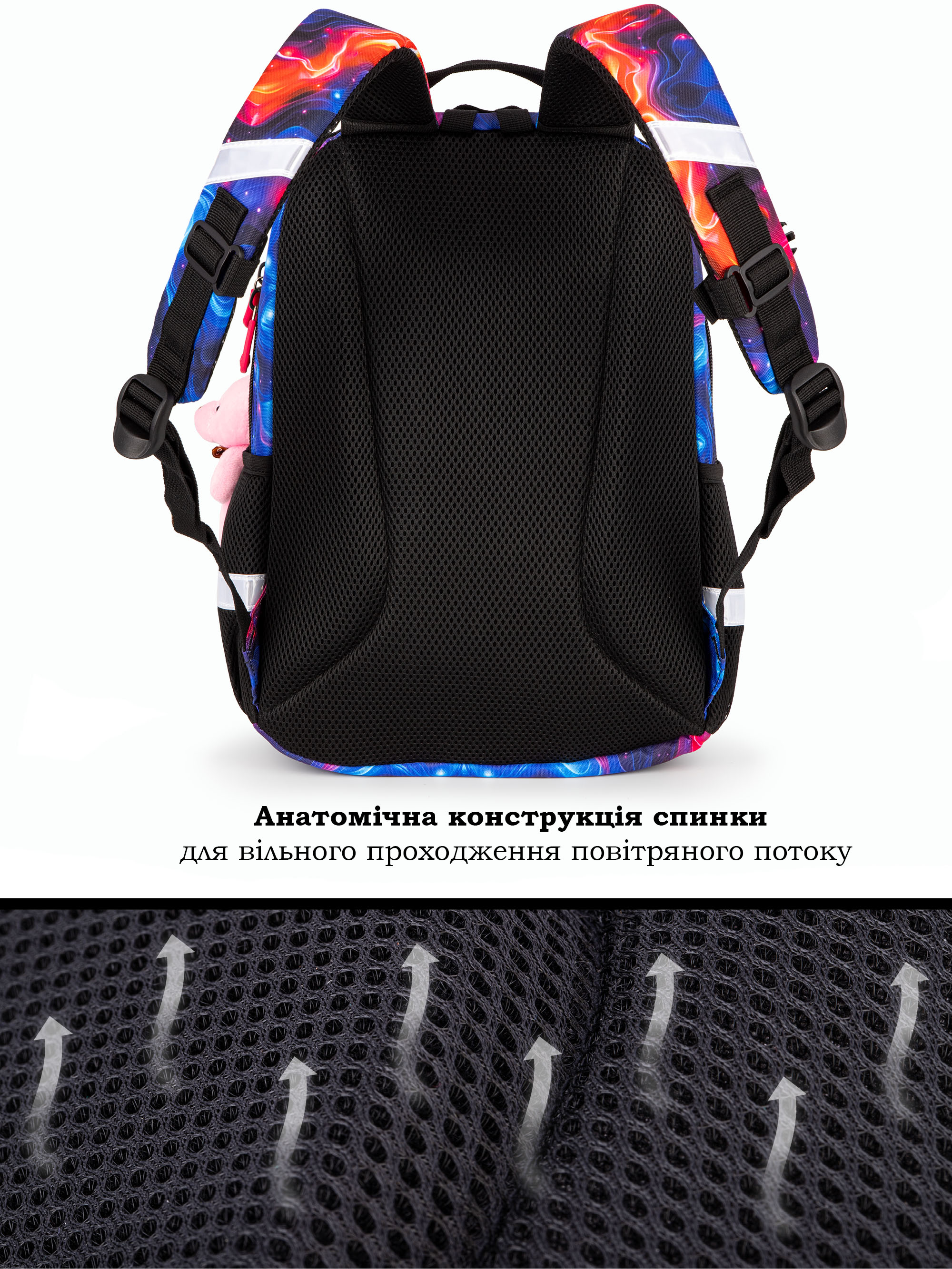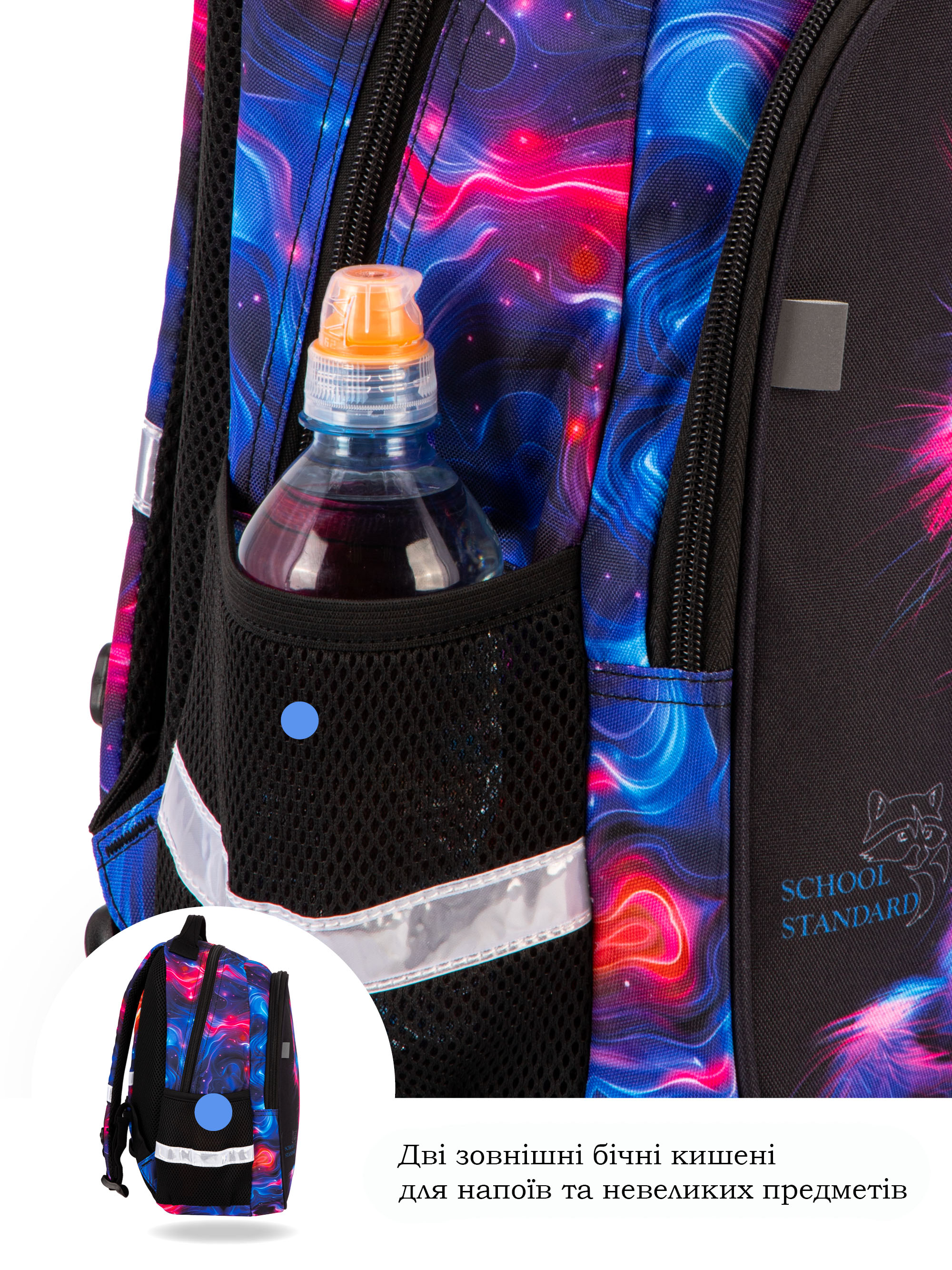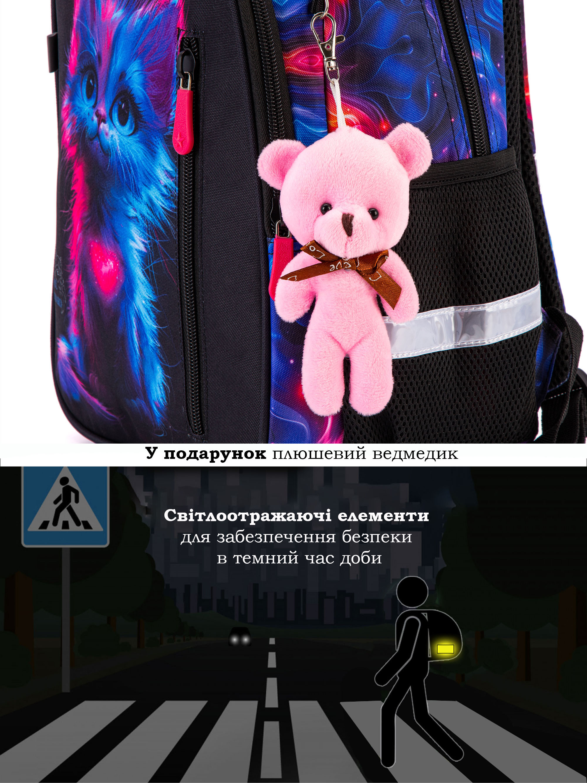 • Світловідбивні елементи спереду, ззаду та з боків шкільного портфеля