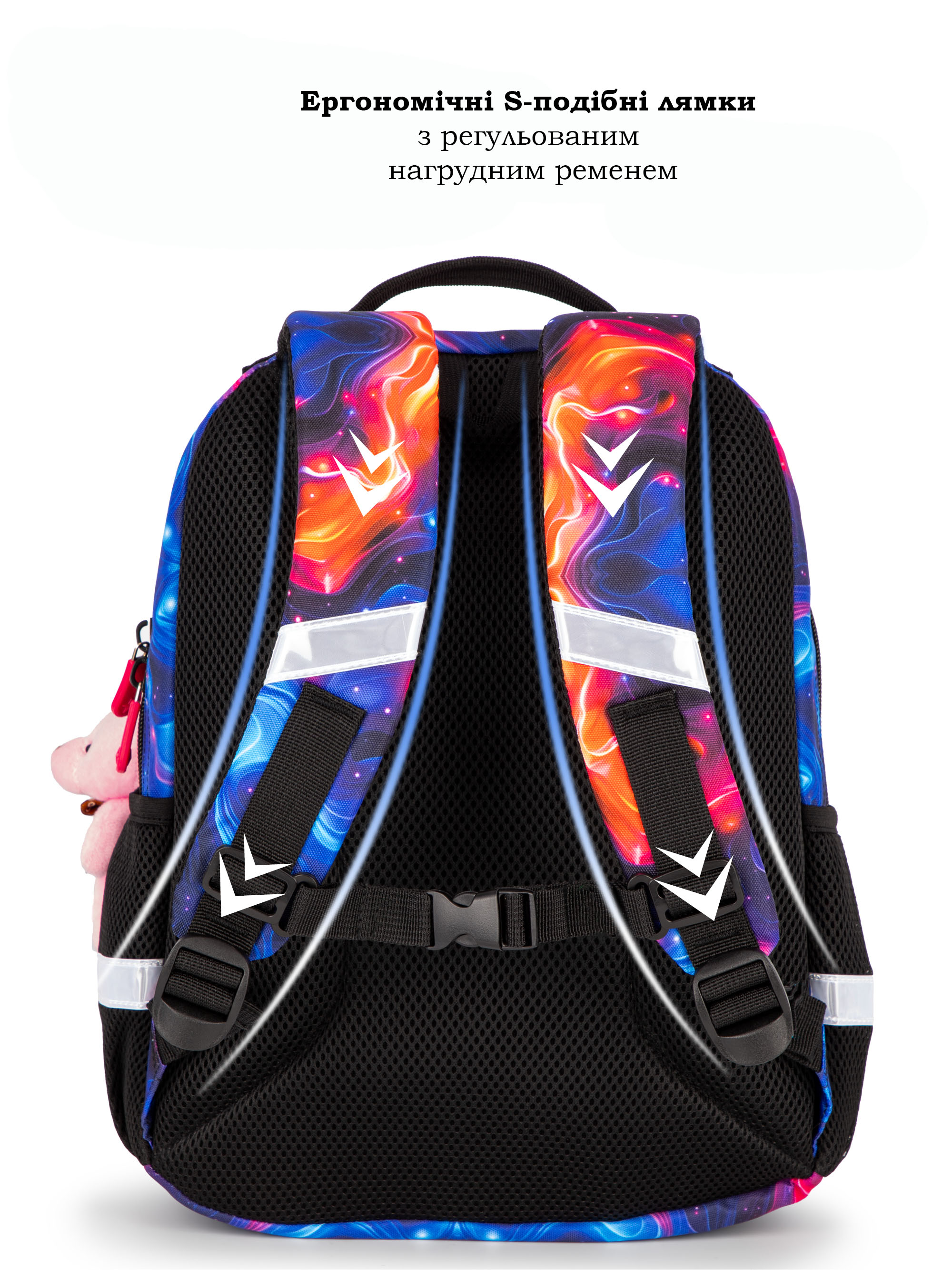 Ергономічні лямки-маєчки рюкзака для молодших класів з регульованим нагрудним ременем та застібкою фастекс. Лямки щільні з додатковими вставками з внутрішньої сторони. Довжину можна регулювати.