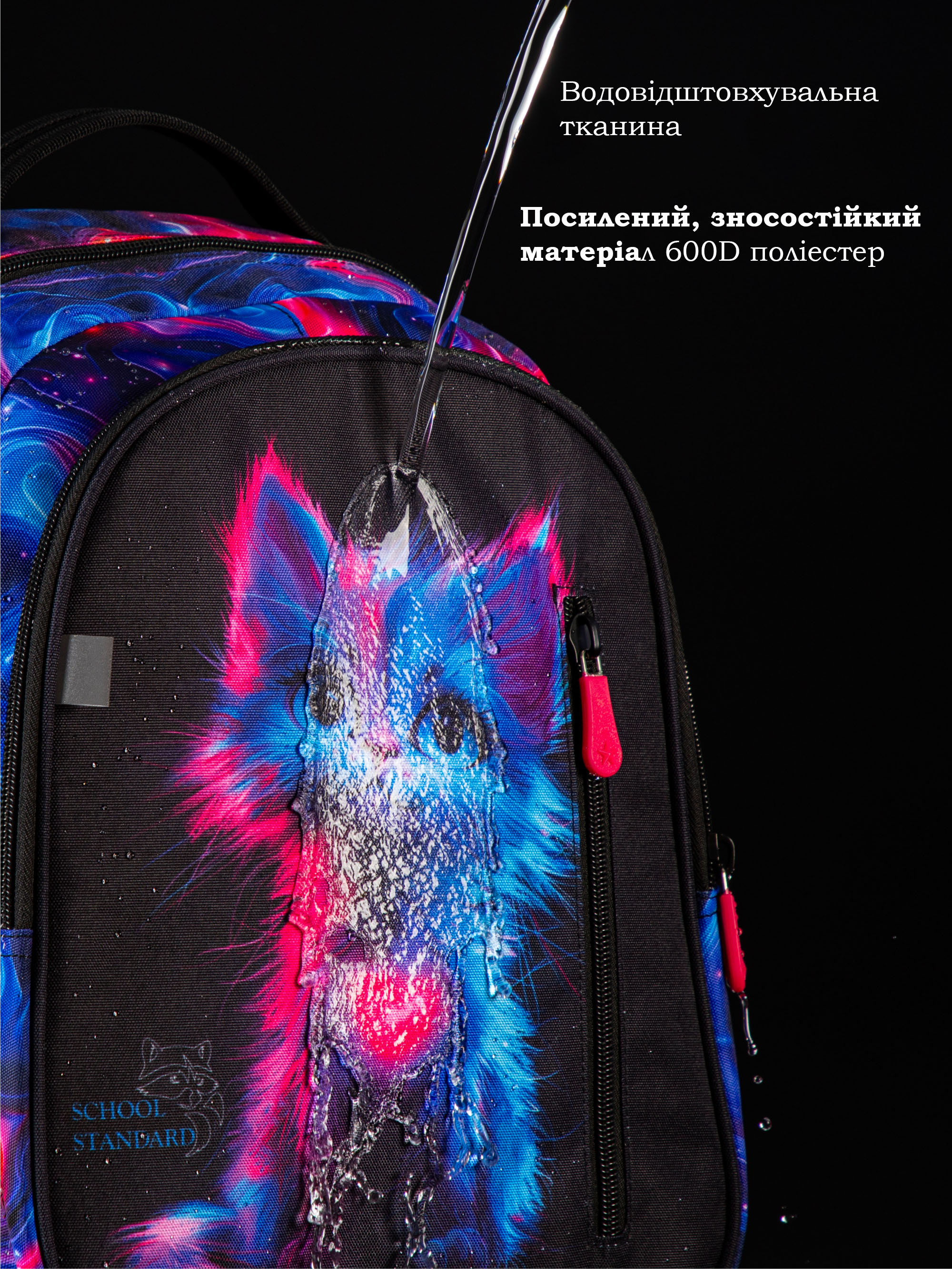 Рюкзак для школярів виконаний з водовідштовхувальної тканини для захисту вмісту від вологи та дощу.